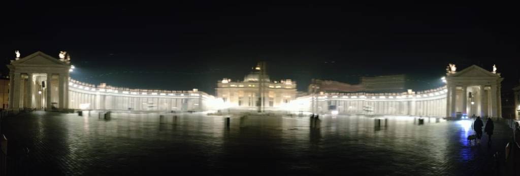 La mañana empezó con un paseo por el Borgo Pío, pegado al Vaticano, sin gente por las calles, observando la extraña mezcla que se produce entre las tiendas de recuerdos con escaparates llenos de camisetas de la Roma y otras cosas no menos tipicas tópicas (y fabricadas en China) y las tiendas de artículos religiosos con las casullas, las dalmáticas y los cálices expuestos (y, a lo mejor, también fabricados en China); mi día concluyó en el mismo lugar observando las luces de la Basílica de San Pedro, de nuevo vacía de turistas.