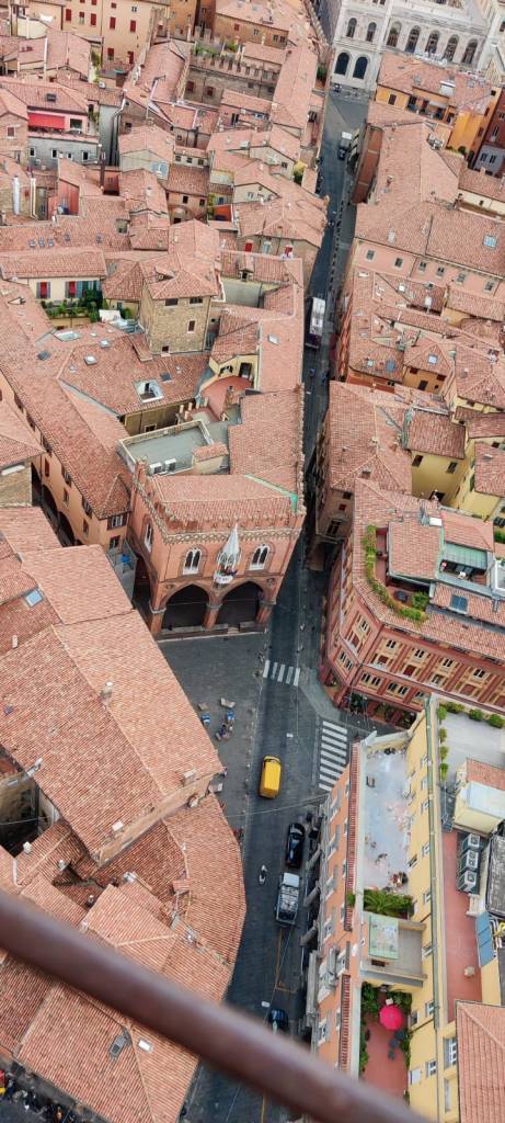 Las tardes siempre se dedican a actividades culturales. Ayer nos tocaba subir a las torres de Garisenda y Asinelli, más concretamente a la de Asinelli: 490 escalones que, al final, te ofrecen una panorámica esplendida de Bolonia que ayuda a comprender porque es Bolonia la rossa (la roja) y no, no es sólo por la orientación política de la ciudad.