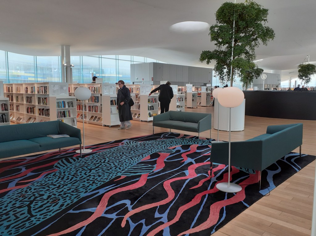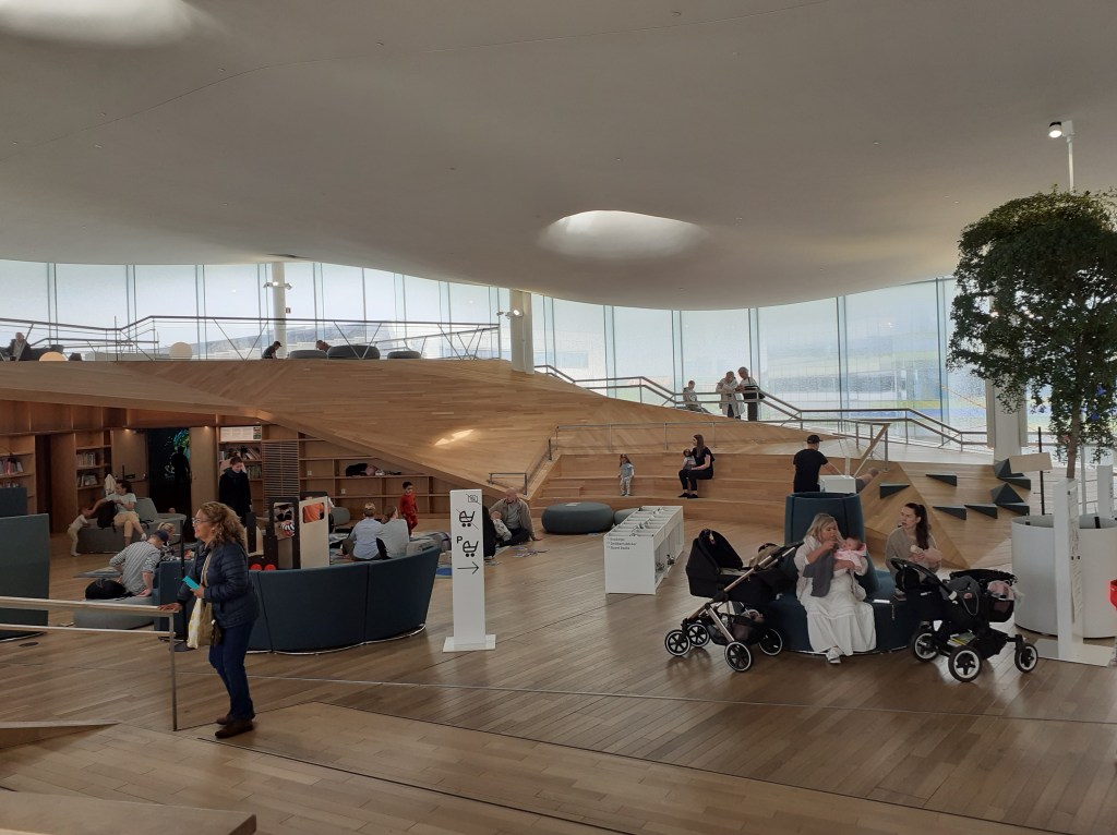 Hoy es miércoles y antes del curso, que tenía lugar aún por la tarde, hemos tenido la ocasión de conocer la biblioteca de Helsinki,Oodi. Un lugar que no podíamos dejar de visitar. Nuestra compañera Pepa Antiñolo insistió e insinuó algunos detalles. Aún así estoy totalmente impresionada ante tan bello edificio en el interior y concebido a la medida de una sociedad respetuosa con todo lo público. Es una lista infinita de actividades que se brinda a todos los sectores de la sociedad: música ( préstamos de instrumentos, cabinas insonorizadas), costura ( máquinas de coser, para hacer ojales, forrrar botones), salas de reuniones de trabajo, cabinas para vídeo llamadas, sala de estudio, espacios para relajarse, préstamos de libros, cabinas de karaoke, cabinas para vídeo juegos en grupo, espacio para los más peques y sus padres con libros a disposición para convertir la lectura en un juego, juegos, alfombras para corretear, posibilidad de alimentar a los bebes, espacio para dejar carros infantiles, sillones y sofás rodeados de libros….y tan solo un murmullo que en ocasiones es casi el silencio.