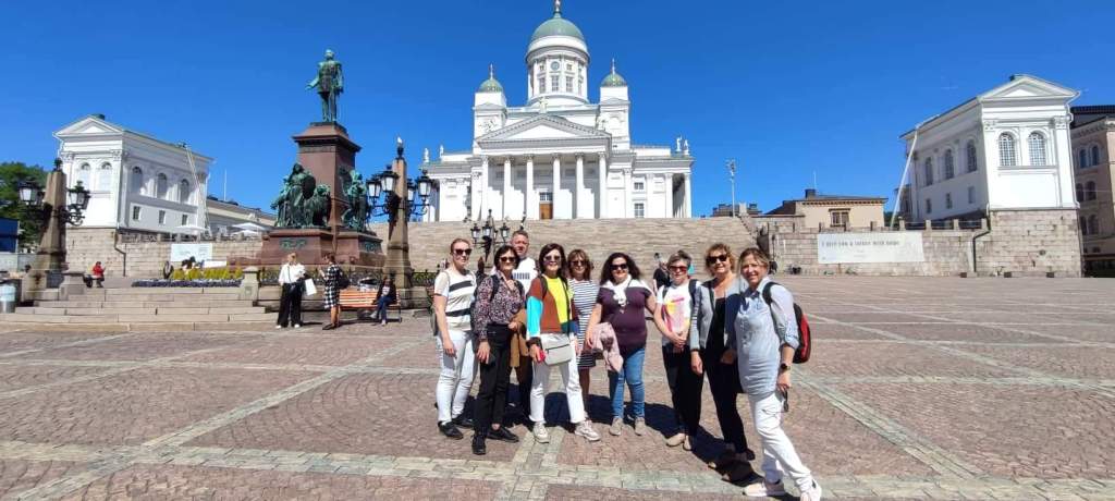 El martes empieza con un tour por la ciudad. Muy ilustrativo para situarse y planear las futuras visitas que no debemos perdernos. El guía contextualiza cada parte de la ciudad que visitamos. Muy útil para ir comprendiendo el carácter finlandés que más tarde, en el curso saldrá a relucir en relación con nuestro tema estrella: el famoso modelo finlandés que tanto admiramos y del que iremos descubriendo los secretos. Por supuesto, tal como explicó nuestra compañera Pepa hace unas semanas, nos hablan de la lengua sueca aún presente en la sociedad finlandesa. De hecho, todas las indicaciones aparecen en los dos idiomas. Una pequeña parte de de la población sueca es suecoparlante, otra es bilingüe aunque ya más del 60% habla finés