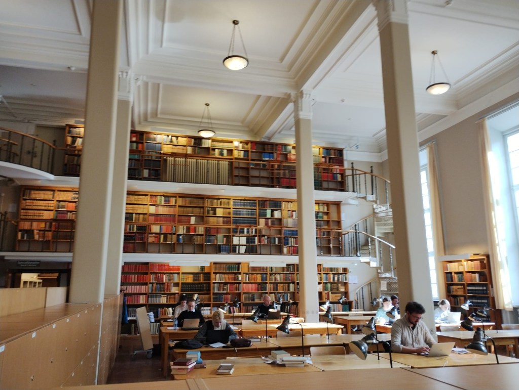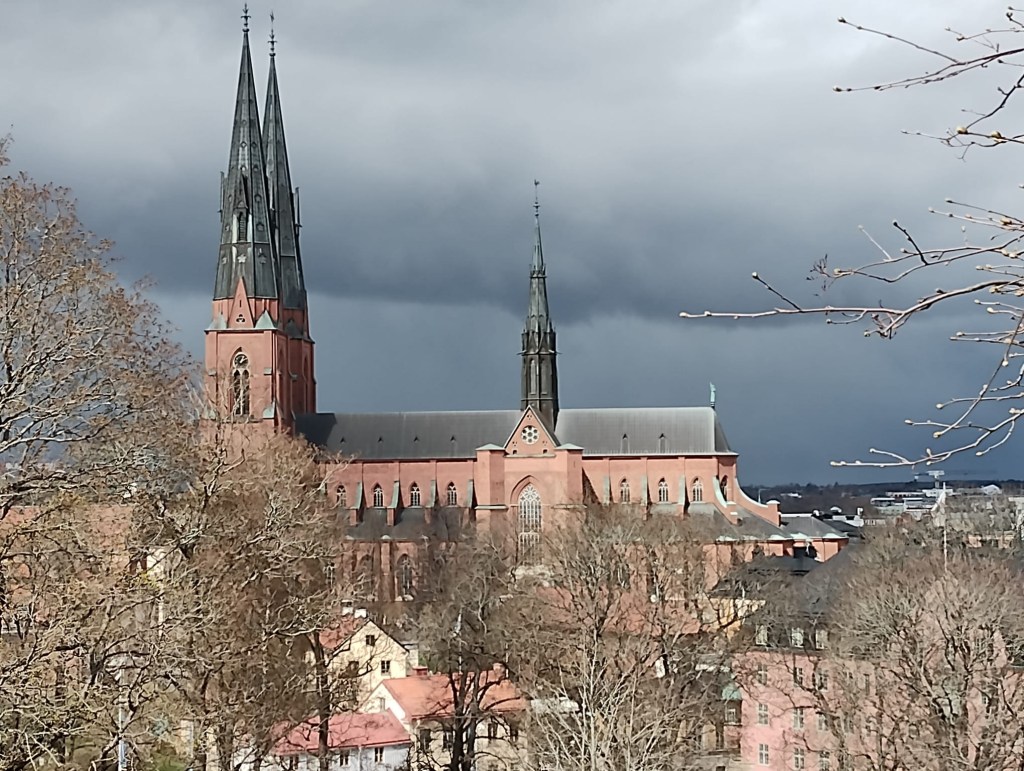 El recorrido en Uppsala viene amenizado por una tormentaza de granizos pequeños, viento y frío que nos obliga a refugiarnos durante un rato en la catedral luterana de Uppsala, que teníamos previsto visitar. Hay un concierto de órgano que nos hace olvidar por un momento que estamos calados. Afortunadamente, aquí el tiempo en primavera es súper cambiante y nos permite después dar una vuelta por la ciudad y ver todos los lugares recomendados: Un paseo por la orilla del río Fyris y una visita a Carolina Rediviva, el edificio principal de la bibioteca de la universidad. El nombre latino hace alusión a la antigua sede de la universidad, la Academia Carolina.